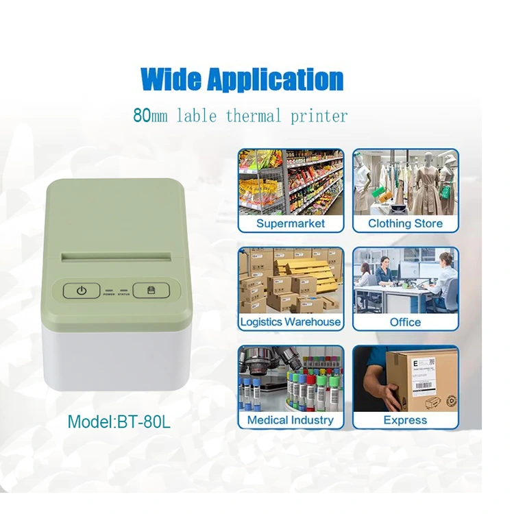 Ang konsepto ng disenyo ng aming color thermal label printer ay upang bigyang-daan ang mga customer na magamit ito sa mga factory warehouse system, maliliit na retail na tindahan na kailangang mag-print ng maliliit na label, mag-print ng maliliit na label, barcode, shipping mark, sticker, atbp. Ang 80L na modelo ay maaaring suportahan ang pag-print sa mga lapad mula 20 hanggang 80mm, na ginagawa itong angkop para sa iba't ibang mga customer na may iba't ibang pangangailangan. Ito ay idinisenyo upang maging compact sa laki, ginagawa itong maginhawa upang dalhin at ilagay.